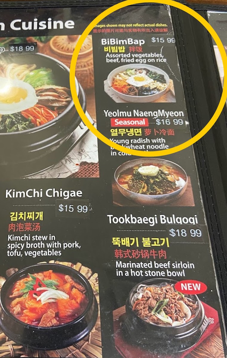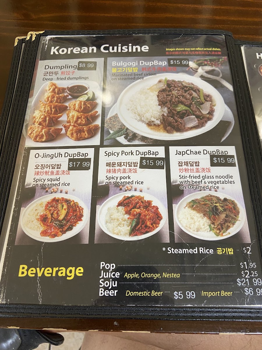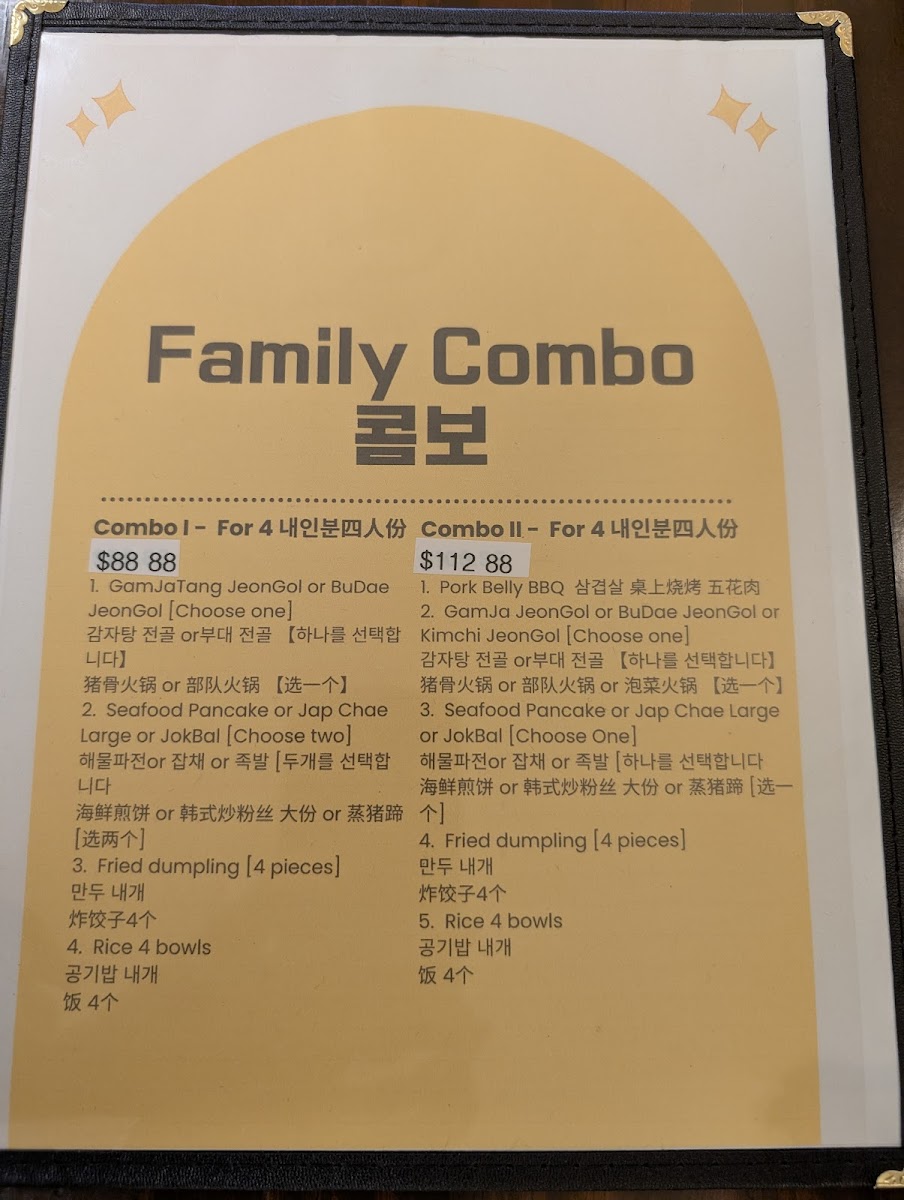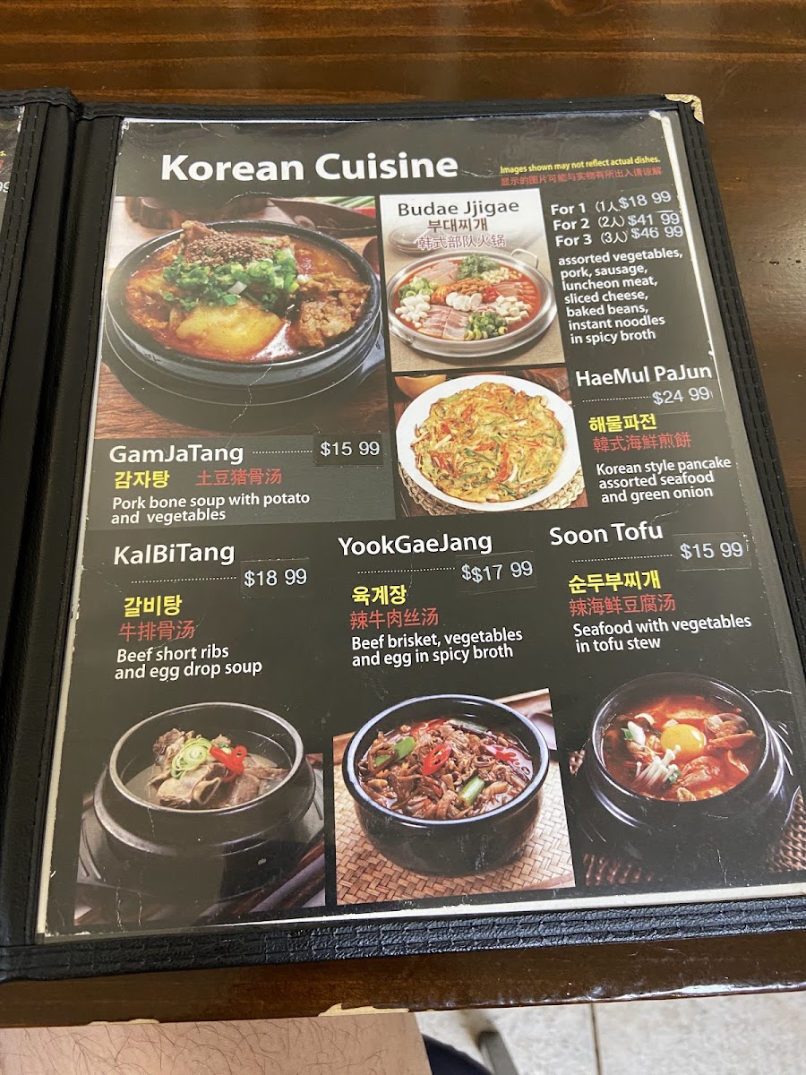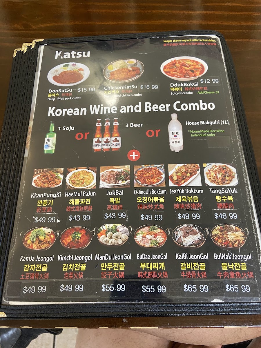 The menu at 친구 Korean Restaurant offers a variety of traditional Korean dishes and beverages, organized to accommodate different dining preferences. It features a selection of appetizers and main courses including bulgogi, bibimbap (mixed rice with beef and vegetables), and soon tofu (spicy soft tofu stew). Visitors can also find a range of hot pots such as Kamjatang Jeongol (pork bone with potato, dumpling, and vegetables), Bulnak Jeongol (beef with octopus and vegetables), and Kimchi Jeongol (kimchi stew with pork and glass noodles), suitable for sharing. Additional dishes include haemul pajeon (seafood pancake), dumplings (군만두), spicy pork bulgogi, japchae (stir-fried glass noodles), and various meat options like kalbi (marinated beef short ribs) and pan fried pork and ribs.